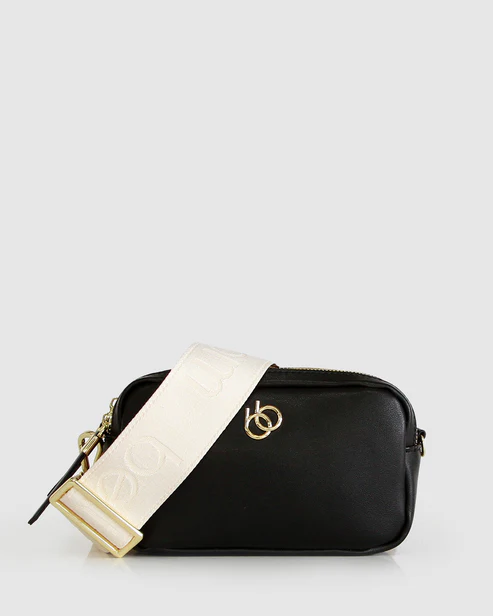 Dual zip compartments help keep your items organised in the Made You Look Camera Bag. A detachable custom belle & bloom webbing strap add subtle contrast to this classic, timeless style.